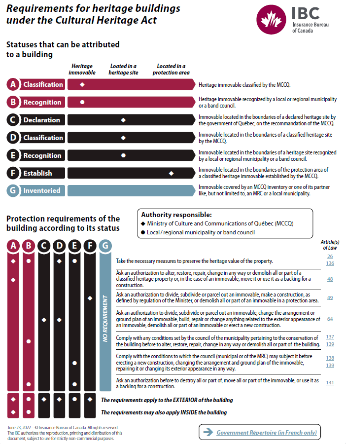 IBC provides insurance stakeholders and consumers with tools to fully understand the different statutes of buildings of heritage interest. A building to which a heritage value has been attributed, but which has no legal status under the Act, could be subject to other regulations, such as a municipal by-law.