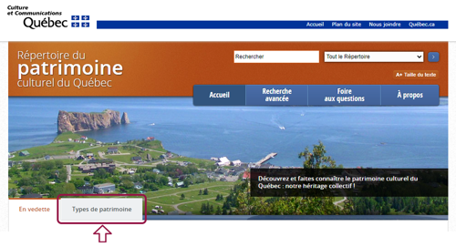 - On the Répertoire du patrimoine culturel (https://www.patrimoine-culturel.gouv.qc.ca/ ), click on the "Types de patrimoine" tab.